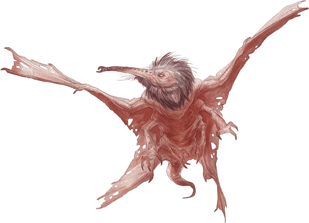 This horrid flying creature looks like a cross between a large bat and an oversized mosquito. Its legs end in sharp pincers, and its long, needle-like proboscis slashes the air as it seeks its next meal.