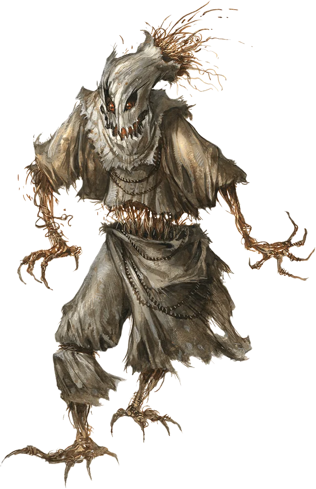 ***Claw.*** *Melee Weapon Attack:* `+3` to hit, reach 5 ft., one target. *Hit:* 6 (`2d4 + 1`) slashing damage. If the target is a creature, it must succeed on a DC 11 Wisdom saving throw or be [frightened](Mechanics/CLI/rules/conditions.md#Frightened) until the end of the scarecrow's next turn.