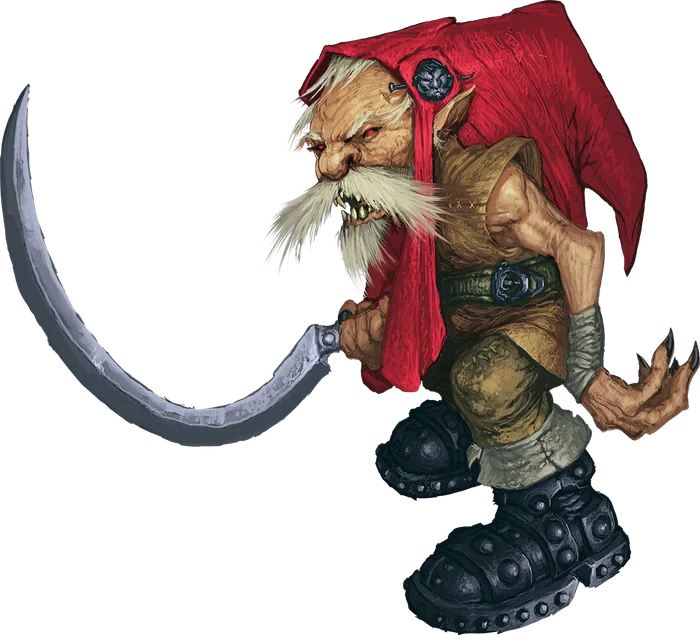 In the Feywild, or where that plane touches the material world at a fey crossing, if a sentient creature acts on an intense desire for bloodshed, one or more redcaps might appear where the blood of a slain person soaks the ground. At first, new redcaps look like tiny bloodstained mushrooms just pushing their caps out of the soil. When moonlight shines on one of these caps, a creature that resembles a wizened and undersized gnome with a hunched back and a sinewy frame springs from the earth. The creature has a pointed leather cap, clothing of similar material, heavy iron boots, and a heavy bladed weapon. From the moment redcaps awaken, they desire only murder and carnage, and they constantly seek to satisfy these cravings.