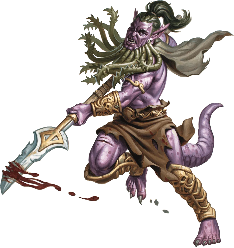 A bearded devil is humanoid in form, with pointed ears, scaly skin, a long tail, and claws that clearly show its fiendish nature. These devils take their names from the snakelike growths that adorn their chins, which they use to lash and poison enemies, weakening them with their virulent venom.