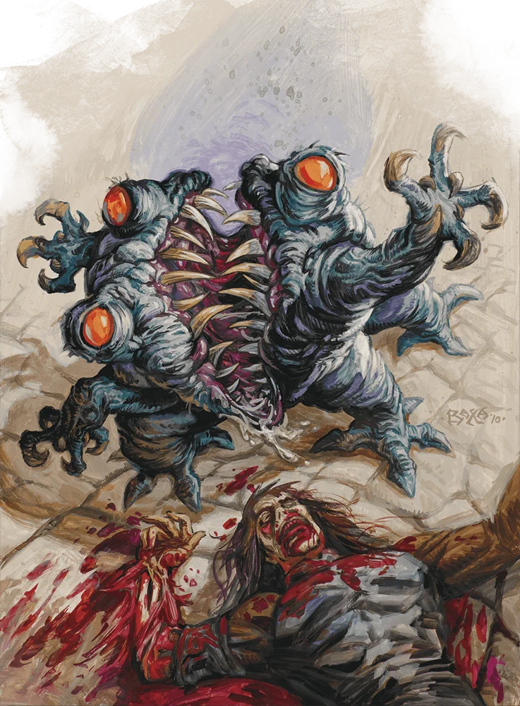 Maw demons share the ceaseless hunger for carnage and mortal flesh of their master, Yeenoghu, who appears in this book. After a maw demon rests for 8 hours, anything devoured by it is transported directly into the Lord of Savagery’s gullet.