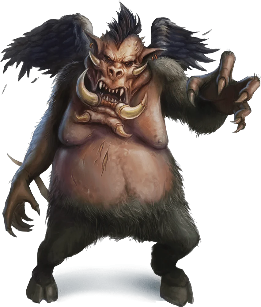 The nalfeshnee is one of the most grotesque demons-a corpulent mockery of ape and boar standing twice the height of a human, with feathered wings that seem too small for its bloated body. These brutish features conceal a remarkable intelligence and cunning.