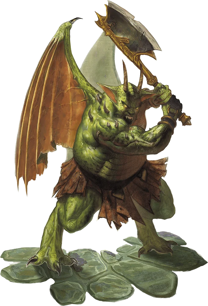 The elite airborne shock troops of the yugoloths, nycaloths look like muscular gargoyles. Powerful bat wings bear them swiftly aloft in battle, and the razor-sharp claws of their hands and feet cut through flesh and bone with ease. A nightmarish foe, a nycaloth strikes hard and fast without warning, then teleports away. It uses its innate magic to turn invisible or create illusory doubles of itself, further confounding its enemies.