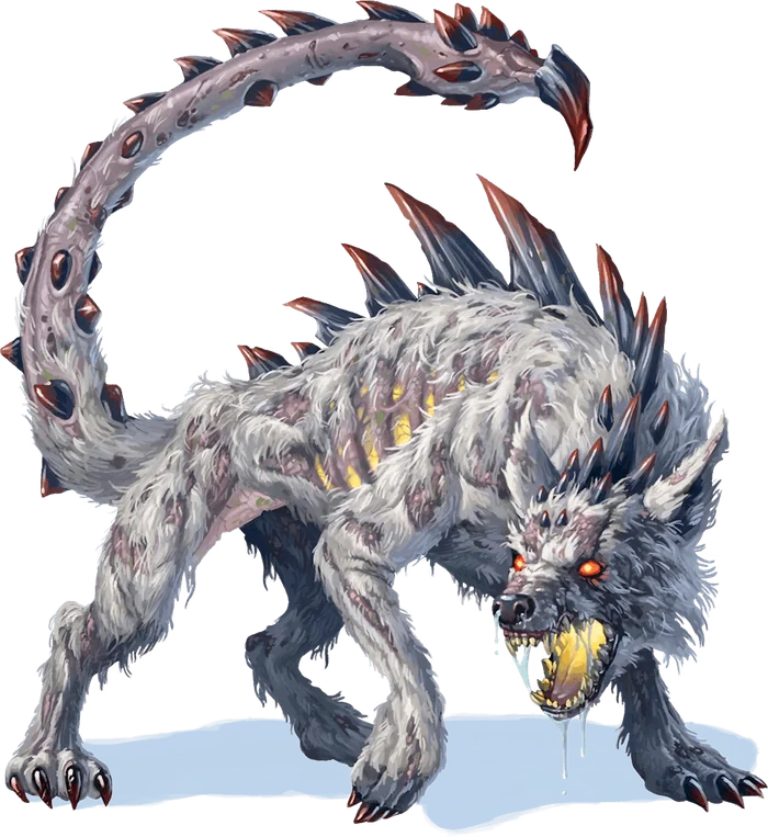 A shoosuva is a hyena-demon gifted by Yeenoghu to an especially powerful worshiper (typically a fang of Yeenoghu). A shoosuva manifests shortly after a Yeenoghu-worshiping war band achieves a great victory, emerging from a billowing, fetid cloud of smoke as it arrives from the Abyss. In battle, the demon wraps its slavering jaws around one victim while lashing out with the poisonous stinger on its tail to bring down another. A creature immobilized by the poison becomes easy pickings for any nearby members of the war band.