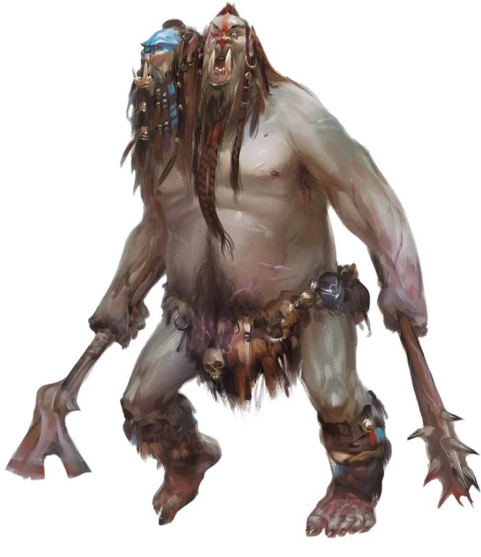 In ancient dialects of Common, the word “ettin” translates as “ugly giant.” Legends tell of orcs that once stumbled upon a temple to Demogorgon, the magic of which transformed them into giant mockeries of the twin-headed Prince of Demons. Driven to near madness, these creatures scattered into the wilderness to become the first ettins.
