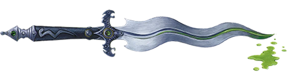 ***Shortsword.*** *Melee Weapon Attack:* `+6` to hit, reach 5 ft., one target. *Hit:* 6 (`1d6 + 3`) piercing damage, and the target must make a DC 15 Constitution saving throw, taking 24 (`7d6`) poison damage on a failed save, or half as much damage on a successful one.