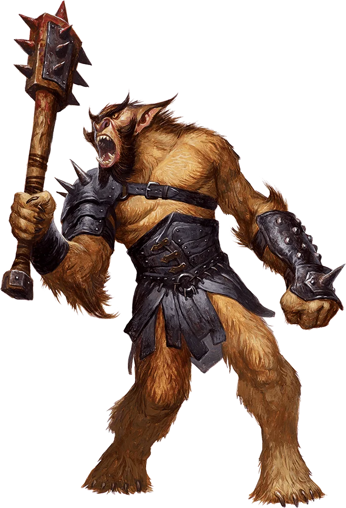 Bugbears worship Hruggek, a lesser god who dwells on the plane of Acheron. In the absence of their goblinoid kin, bugbears form loose war bands, each one led by its fiercest member. Bugbears believe that when they die, their spirits have a chance to fight at Hruggek’s side. They try to prove themselves worthy by defeating as many foes as possible.