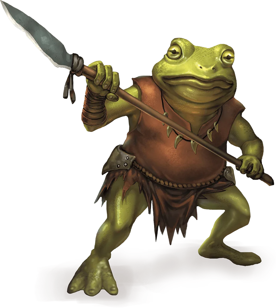 Bullywugs have green, gray, or mottled yellow skin that shifts through shades of gray, green, and brown, allowing them to blend in with their surroundings. They wear crude armor and wield simple weapons, and can deliver a powerful bite to foes that press too close.