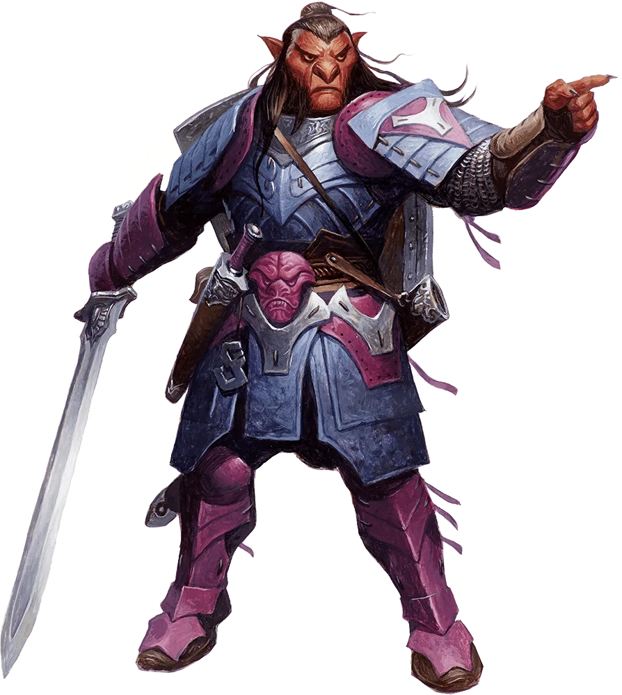 Hobgoblins have dark orange or red-orange skin, and hair ranging from dark red-brown to dark gray. Yellow or dark brown eyes peer out beneath their beetling brows, and their wide mouths sport sharp and yellowed teeth. A male hobgoblin might have a large blue or red nose, which symbolizes virility and power among goblinkin. Hobgoblins can live as long as humans, though their love of warfare and battle means that few do.