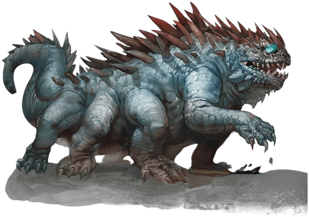 Basilisks are ponderous for hunting creatures, but they needn’t chase prey. Meeting a basilisk’s supernatural gaze can be enough to affect a rapid transformation, transforming a victim into porous stone. Basilisks, with their strong jaws, are able to consume the stone. The stone returns to organic form in the basilisk’s gullet.