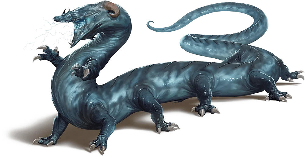 A behir’s monstrous form resembles a combination of centipede and crocodile. Its scaled hide ranges from ultramarine to deep blue in color, fading to pale blue on its underside.