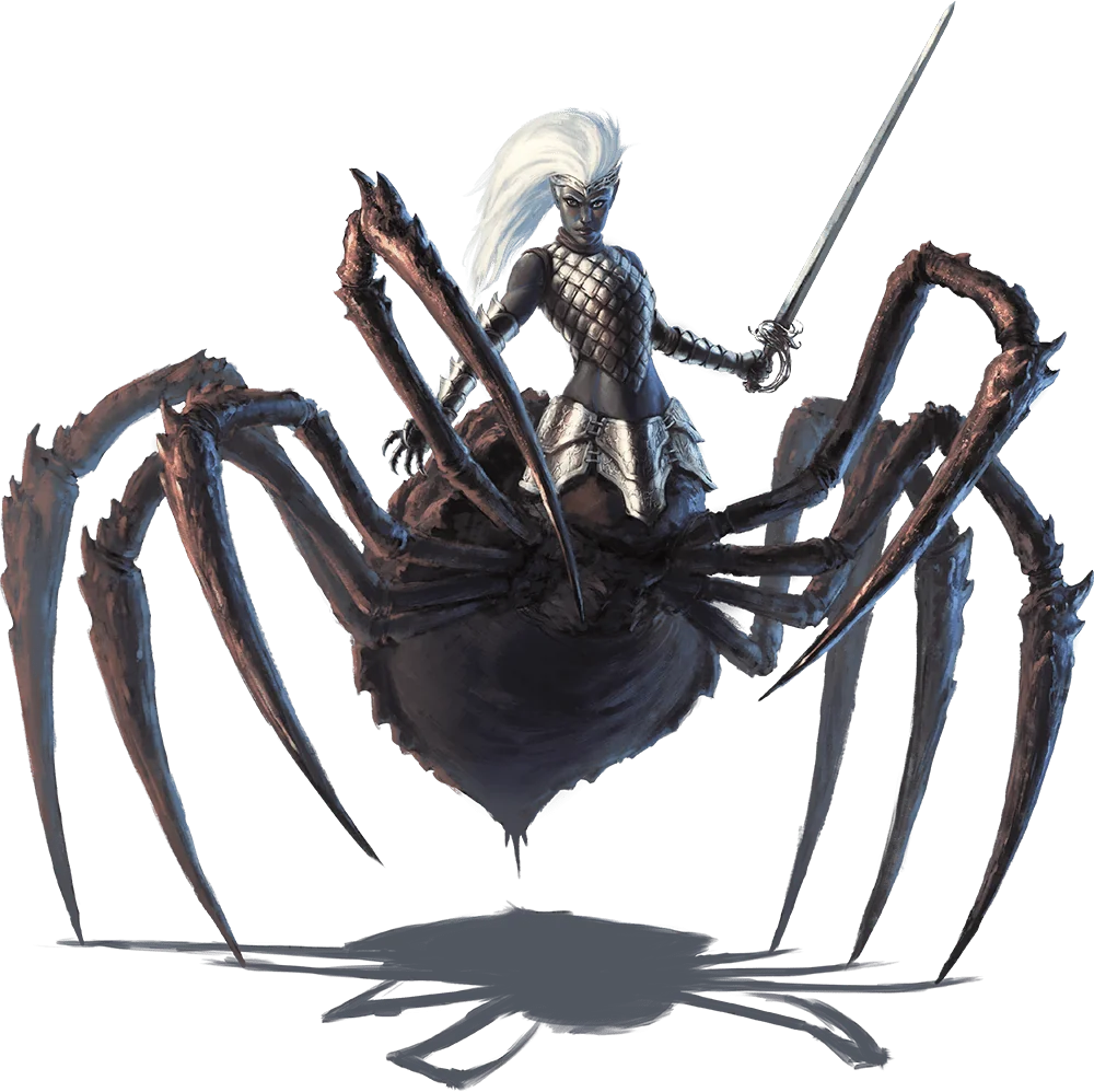 Drow transformed into driders return to the Material Plane as twisted and debased creatures. Driven by madness, they disappear into the Underdark to become hermits and hunters, either wandering alone or leading packs of giant spiders.
