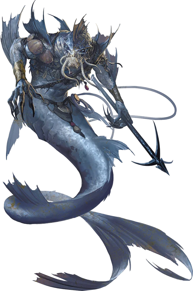 ***Harpoon.*** *Melee or Ranged Weapon Attack:* `+6` to hit, reach 5 ft. or range 20/60 ft., one target. *Hit:* 11 (`2d6 + 4`) piercing damage. If the target is a Huge or smaller creature, it must succeed on a Strength contest against the merrow or be pulled up to 20 feet toward the merrow.Environment
