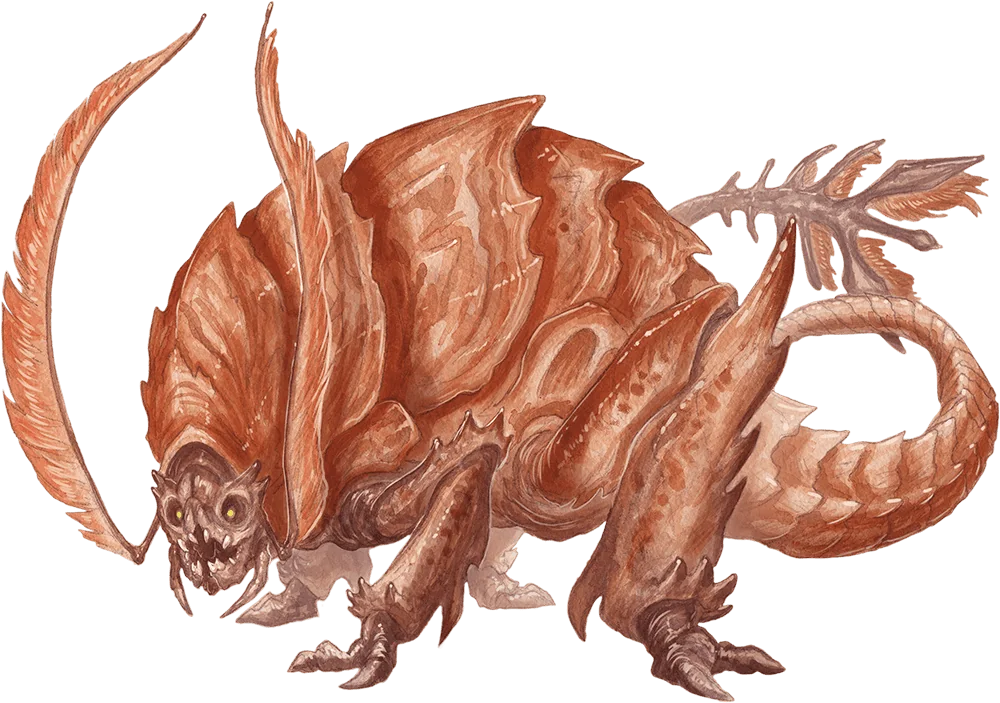 A rust monster’s body is covered in thick, lumpy armor, its long tail ends in a bony protrusion, and two feathery antennae sprout from its insectile head.