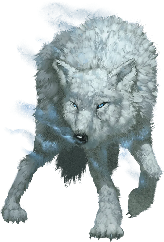 The arctic-dwelling winter wolf is as large as a dire wolf but has snow-white fur and pale blue eyes. Frost giants use these evil creatures as guards and hunting companions, putting the wolves’ deadly breath weapon to use against their foes. Winter wolves communicate with one another using growls and barks, but they speak Common and Giant well enough to follow simple conversations.
