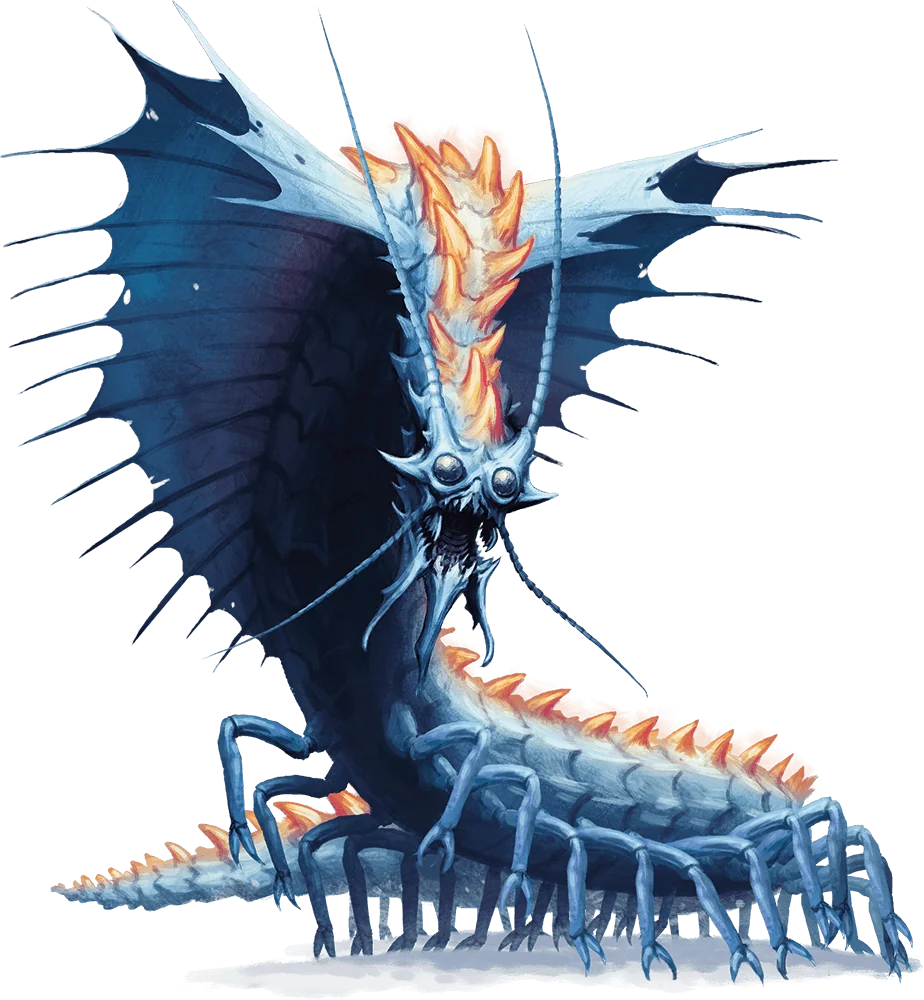 From beneath the snow and ice bursts a remorhaz in a cloud of steam, its body pulsing with internal fire. Wing like fins flare from the back of the creature’s head, and its wide mouth brims with jagged teeth.