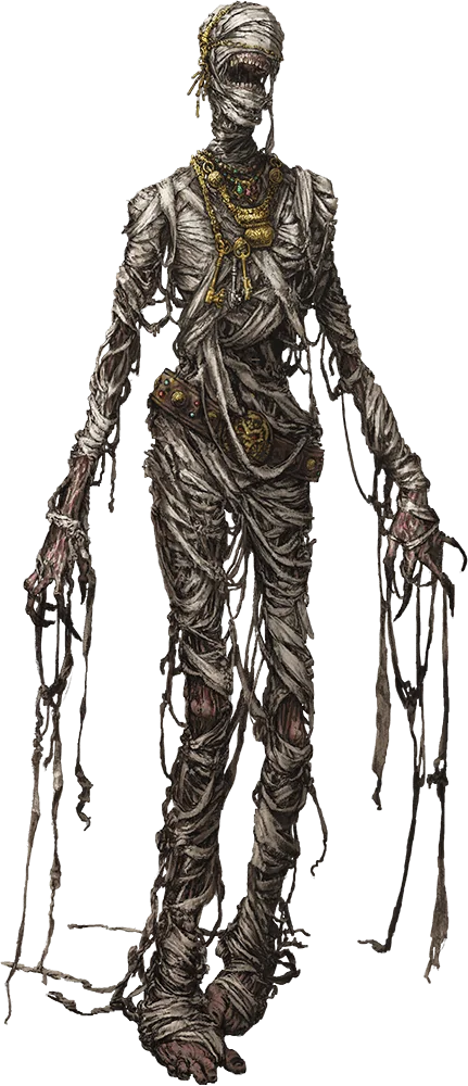 An undead mummy is created when the priest of a death god or other dark deity ritually imbues a prepared corpse with necromantic magic. The mummy’s linen wrappings are inscribed with necromantic markings before the burial ritual concludes with an invocation to darkness. As a mummy endures in undeath, it animates in response to conditions specified by the ritual. Most commonly, a transgression against its tomb, treasures, lands, or former loved ones will cause a mummy to rise.