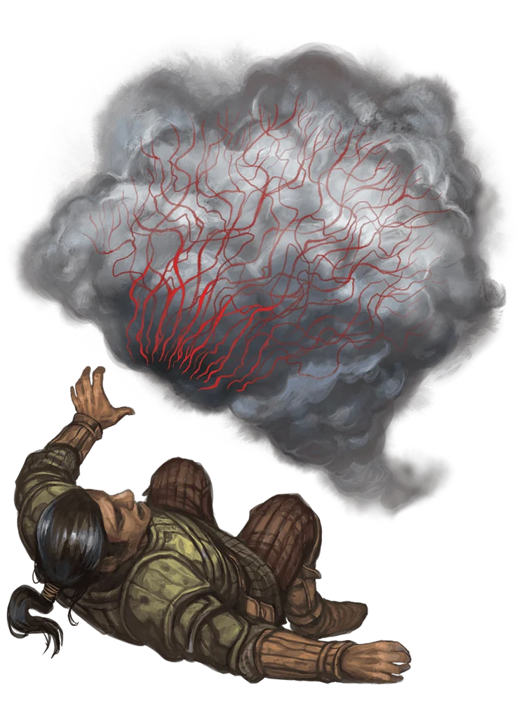 Indistinguishable from fog aside from the charnel reek it exudes, a vampiric mist descends on a creature and causes the blood in the creature’s body to ooze through its pores or spill out from its eyes, nose, and mouth. This blood wafts out from the victim like crimson smoke, which the mist then consumes. The feeding causes no pain or discomfort to the victim, so vampiric mists can feed on sleepers without waking them. The more a mist feeds, the redder it gets, such that it turns pink, then red, and finally a deep scarlet hue; when sated, it rains blood droplets wherever it goes.