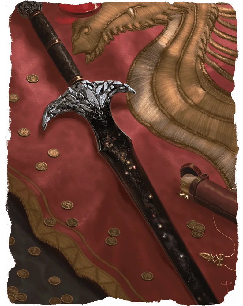 Hidden in the dungeon of White Plume Mountain, Blackrazor shines like a piece of night sky filled with stars. Its black scabbard is decorated with pieces of cut obsidian.