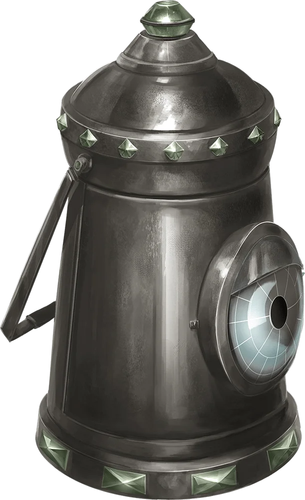While lit, this hooded lantern burns for 6 hours on 1 pint of oil, shedding bright light in a 30-foot radius and dim light for an additional 30 feet. Invisible creatures and objects are visible as long as they are in the lantern’s bright light. You can use an action to lower the hood, reducing the light to dim light in a 5-foot radius.