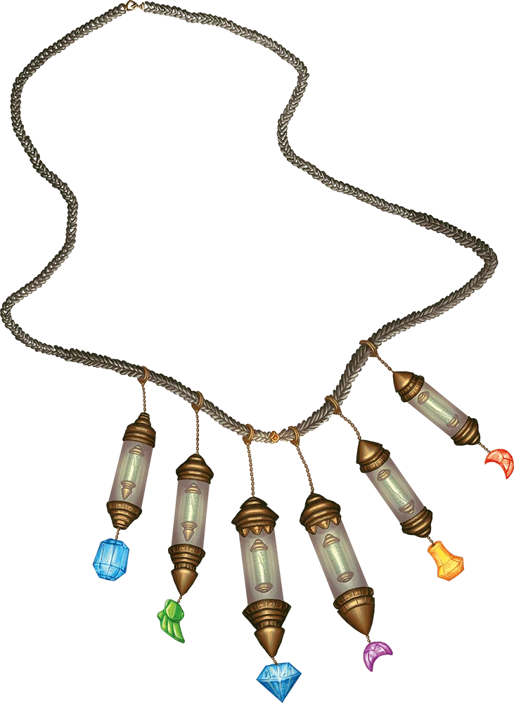 This necklace has 1d4 + 2 magic beads made from aquamarine, black pearl, or topaz. It also has many nonmagical beads made from stones such as amber, bloodstone, citrine, coral, jade, pearl, or quartz. If a magic bead is removed from the necklace, that bead loses its magic.