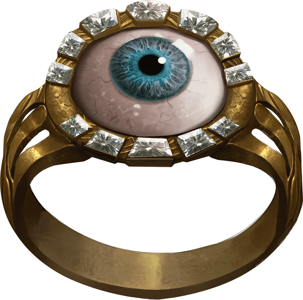 While wearing this ring, you can use an action to speak its command word. When you do so, you can see into and through solid matter for 1 minute. This vision has a radius of 30 feet. To you, solid objects within that radius appear transparent and don’t prevent light from passing through them. The vision can penetrate 1 foot of stone, 1 inch of common metal, or up to 3 feet of wood or dirt. Thicker substances block the vision, as does a thin sheet of lead.