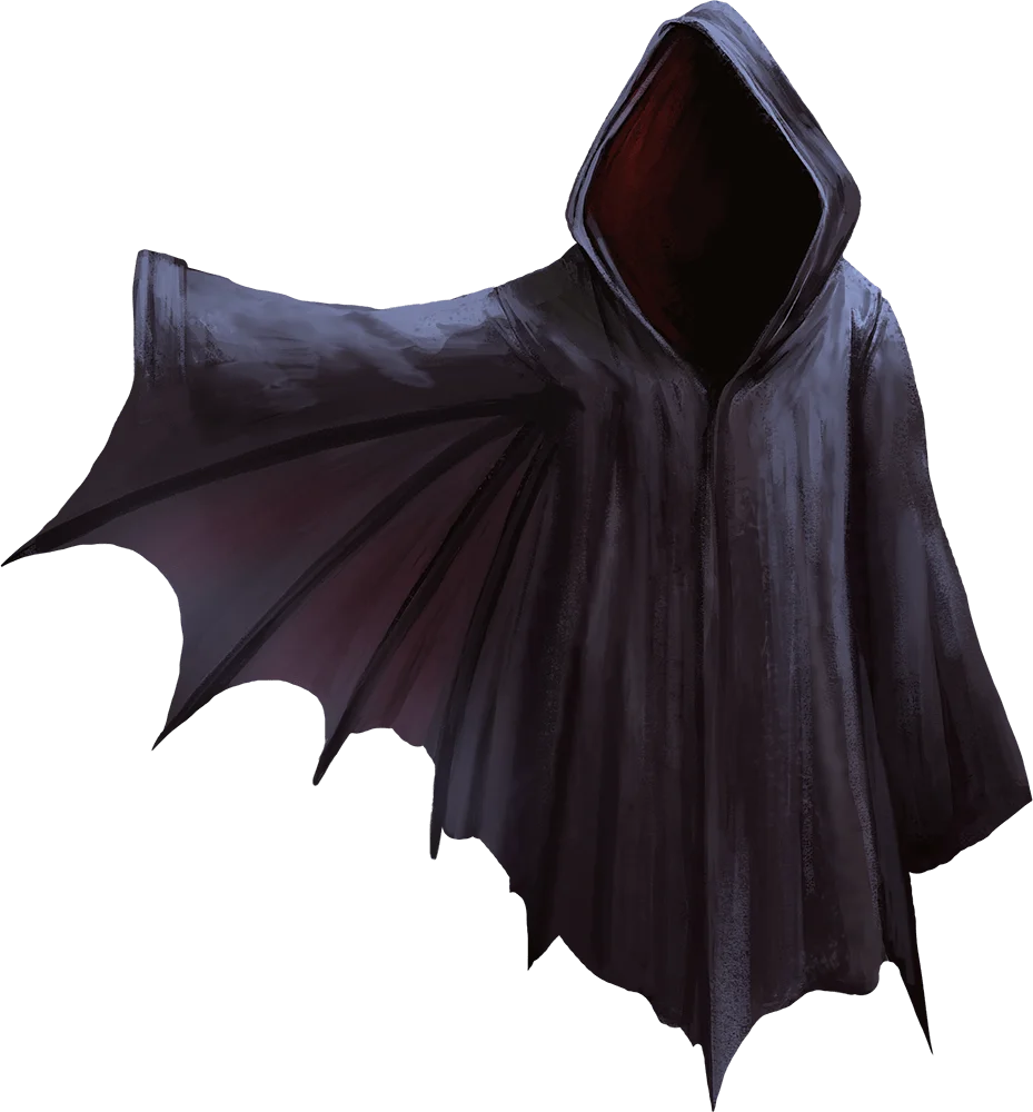 While wearing this cloak, you can use an action to speak its command word. This turns the cloak into a pair of bat wings or bird wings on your back for 1 hour or until you repeat the command word as an action. The wings give you a flying speed of 60 feet. When they disappear, you can’t use them again for 1d12 hours.