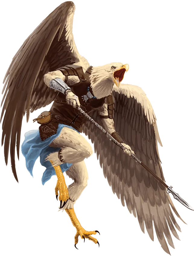 A winged people who originated on the Elemental Plane of Air, aarakocra soar through the sky wherever they wander. The first aarakocra served the Wind Dukes of Aaqa—mighty beings of air—and were imbued with a measure of their masters’ power over winds. Their descendants still command echoes of that power.