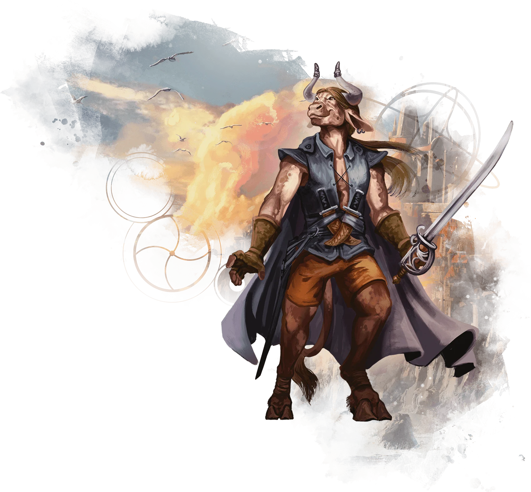 Minotaurs are barrel-chested humanoids with heads resembling those of bulls. Blessed with a supernaturally strong sense of direction, minotaurs make great navigators. Some sages believe minotaurs were first created by the Lady of Pain to patrol the magical mazes that she uses to trap her foes.