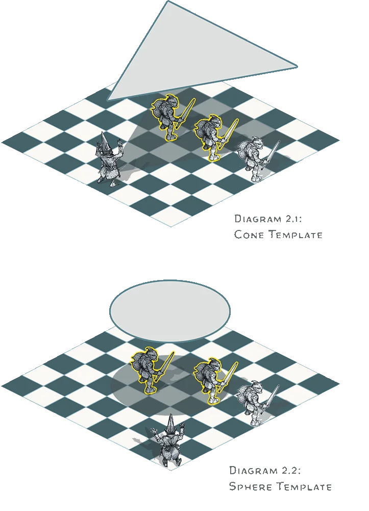 The template method uses two-dimensional shapes that represent different areas of effect. The aim of the method is to accurately portray the length and width of each area on the grid and to leave little doubt about which creatures are affected by it. You’ll need to make these templates or find premade ones.