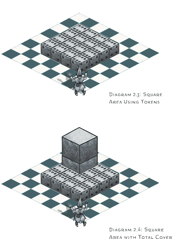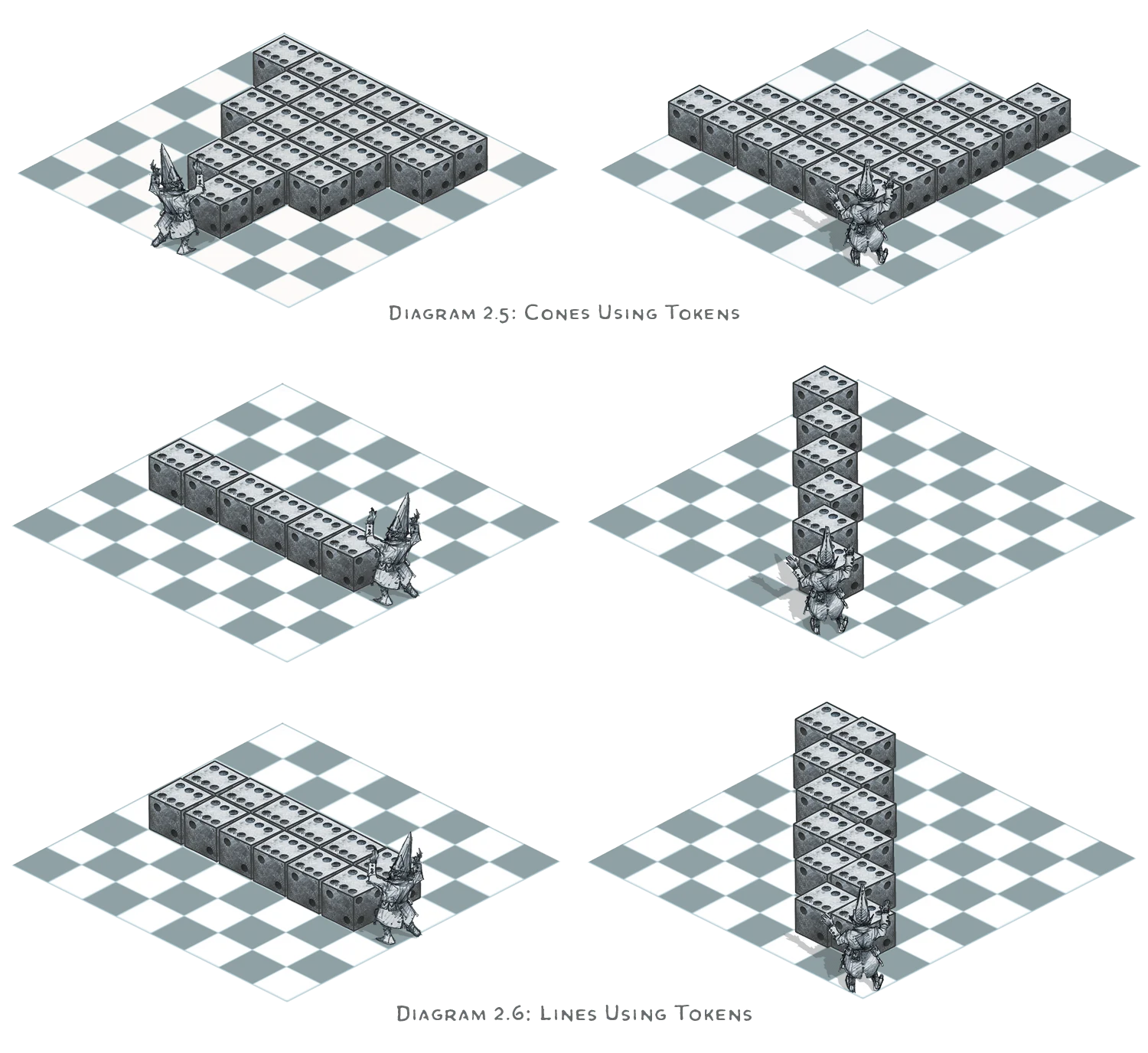 The token method is meant to make areas of effect tactile and fun. To use this method, grab some dice or other tokens, which you’re going to use to represent your areas of effect.