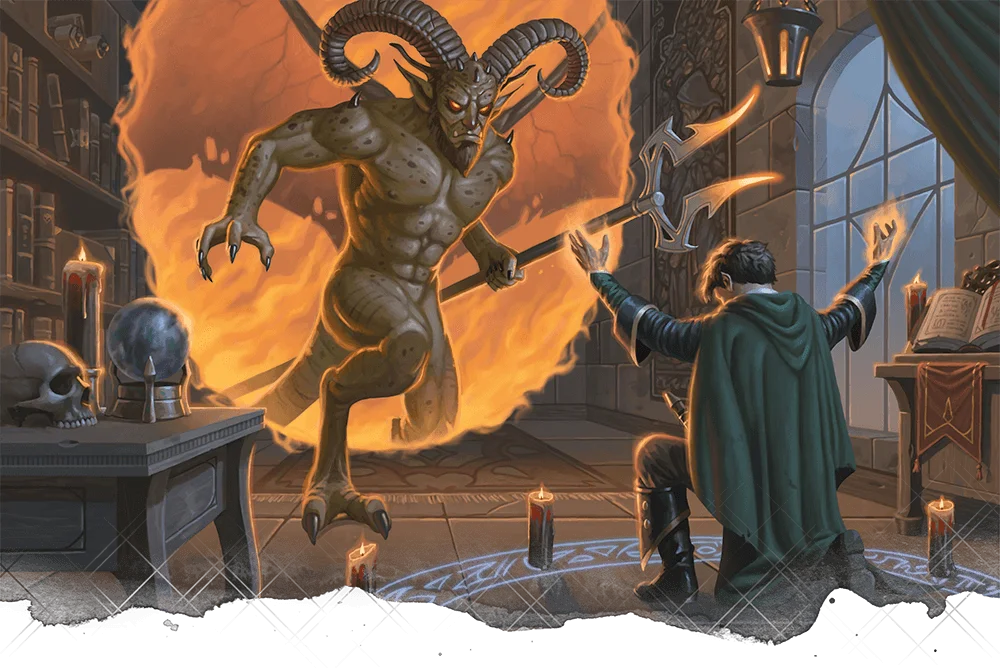 Uttering a dark incantation, you summon a devil from the Nine Hells. You choose the devil’s type, which must be one of challenge rating 6 or lower, such as a barbed devil or a bearded devil. The devil appears in an unoccupied space that you can see within range. The devil disappears when it drops to 0 hit points or when the spell ends.