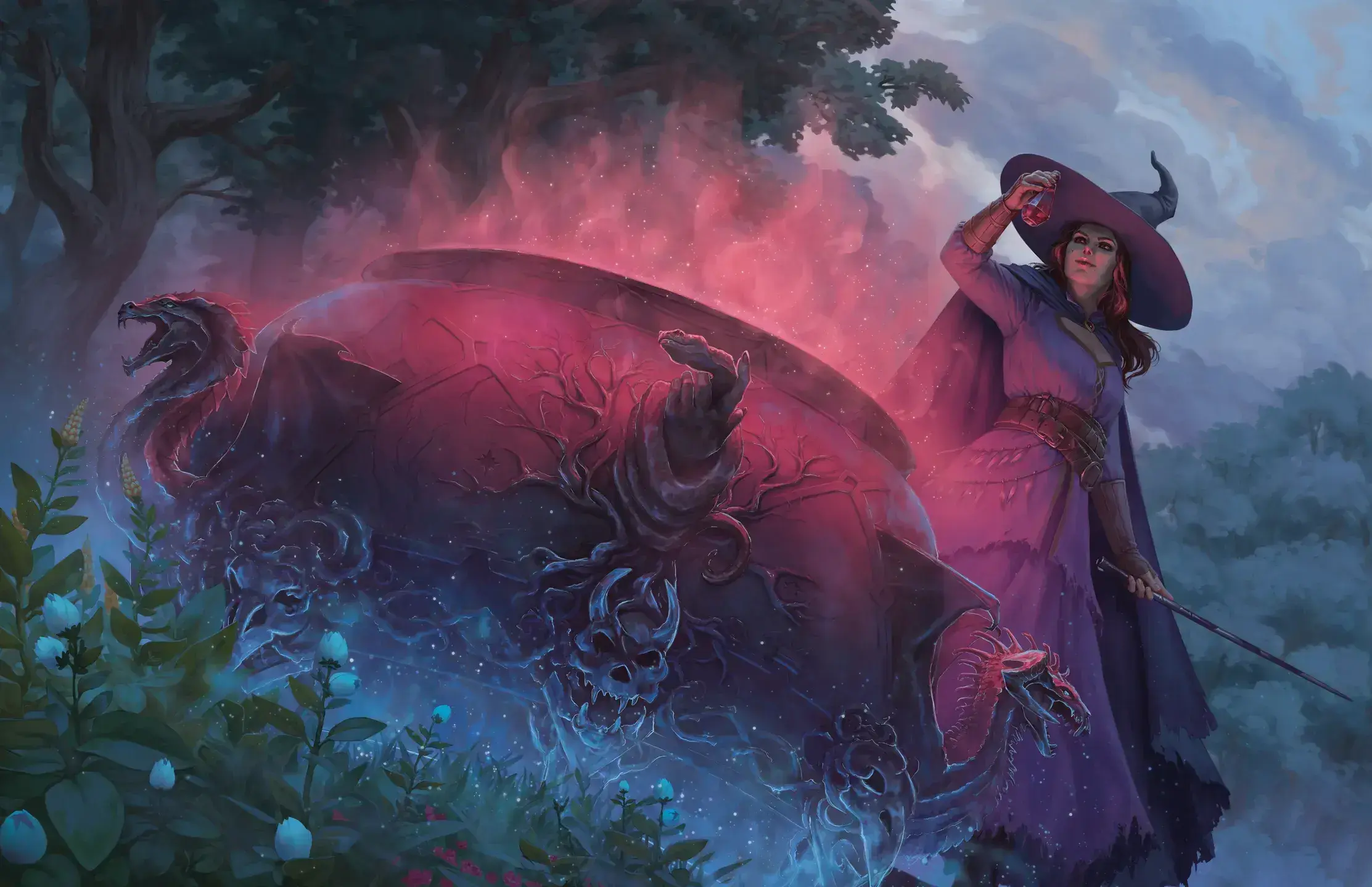 The liquid in the cauldron duplicates the properties of a Common or an Uncommon potion of your choice (such as a Potion of Healing). As a Bonus Action, you or an ally can reach into the cauldron and withdraw one potion of that kind. The potion is contained in a vial that disappears when the potion is consumed. The cauldron can produce a number of these potions equal to your spellcasting ability modifier (minimum 1). When the last of these potions is withdrawn from the cauldron, the cauldron disappears, and the spell ends.